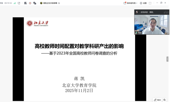 蒋凯做了“教师时间配置对教学科研产出的影响--基于2023年全国高校教师问卷调查的分析”的学术报告。在大量数据调查基础上,围绕教师工作时长、时间配置、时间配置对科研的影响以及影响的学科异质表现进行了研究。结果显示:适度加班与合理的闲暇活动有利于提高教学科研产出,但过长的工作时间可能导致科研产出下降,良好的身心健康、学术交流和教学科研产出、教学与科研之间同时存在相互促进和相互抑制的关系,高校教师教学科研时间均衡配置有利于提高教学科研产出特别是教学科研质量;高校教师适当参与校内管理服务与校外社会服务有利于他们建立学术声誉、获取学术资源,对提升教学科研产出具有一定的积极作用。
