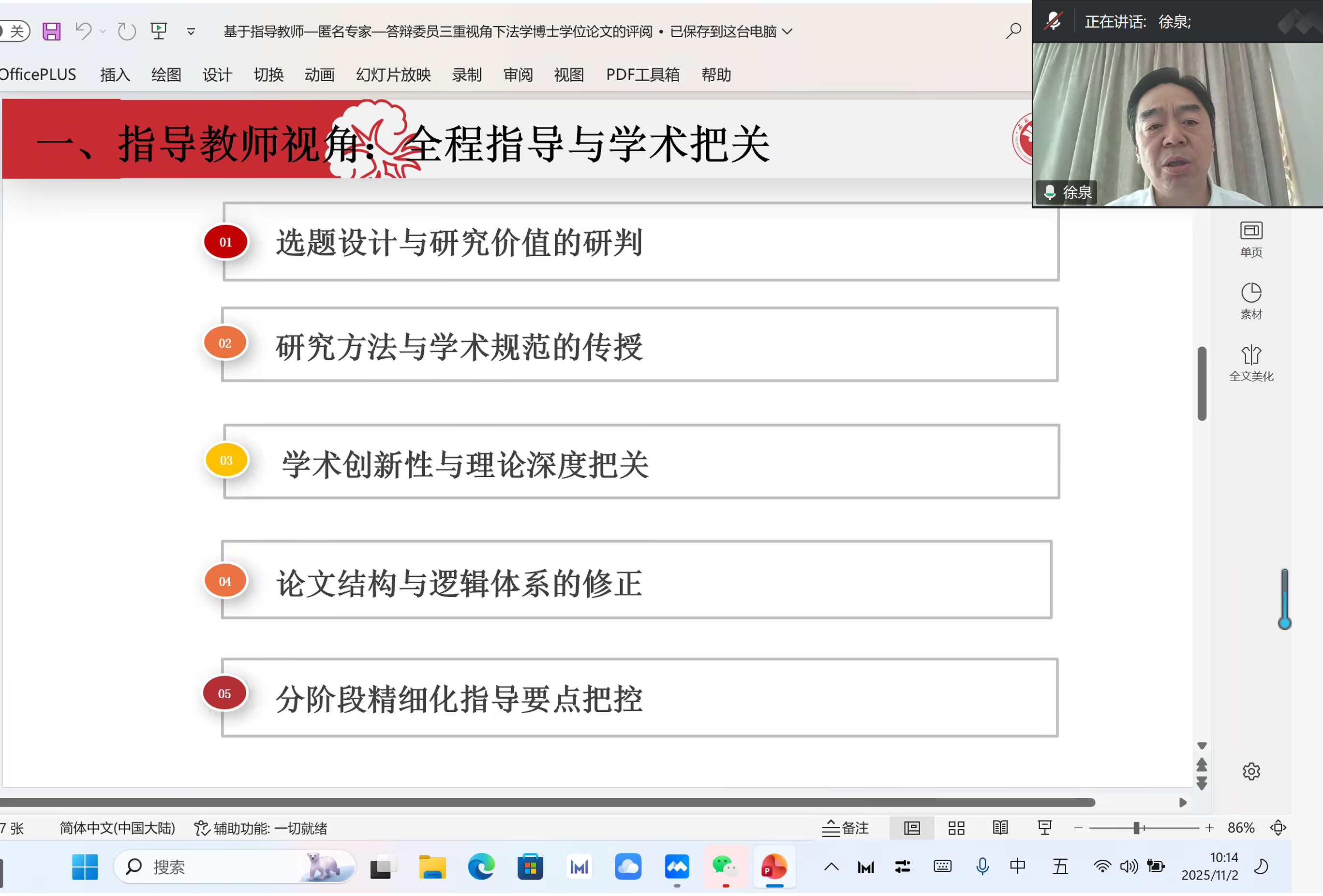 徐泉做了“基于指导教师、匿名专家、答辩委员三重视角下法学博士学位论文的评阅”的主旨发言。指导教师视角需要关注全程指导与学术把关;匿名专家需要客观公正与学术标准的坚守;答辩委员要求综合考察与学术质疑。三重视角,分别涉及论文评阅的基础及过程、关键环节。